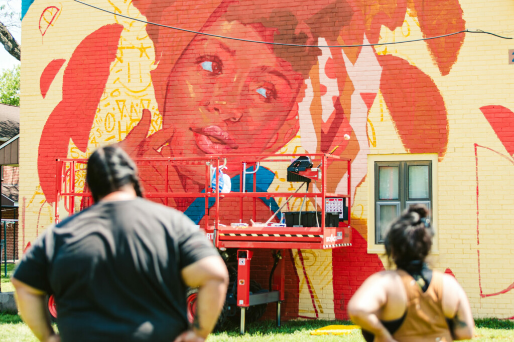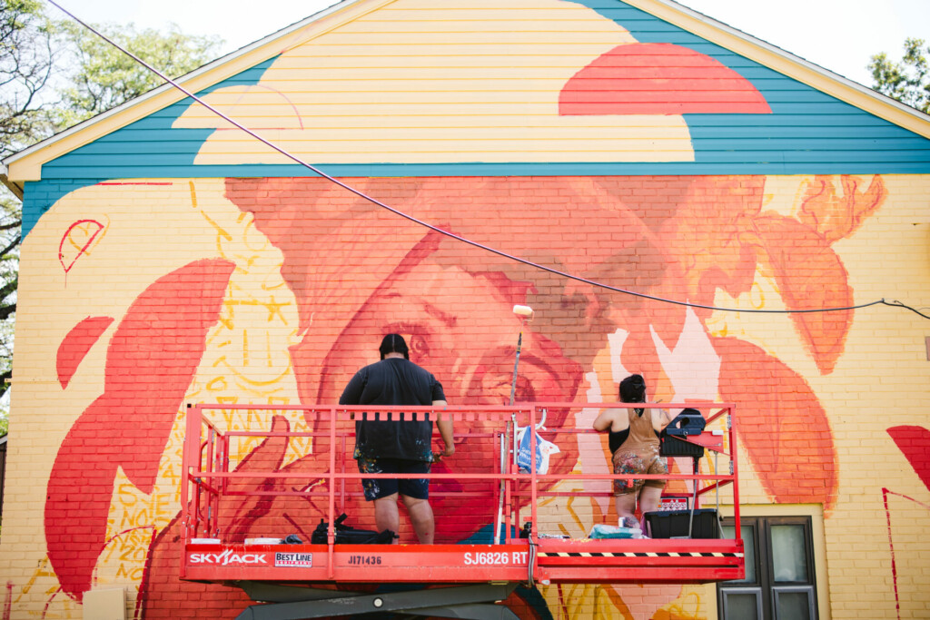 Due to a heatwave that kept the average temperatures in the 90s the week of the mural’s installation, and the wall’s location in full midday sun, the artists would begin painting at dawn and wrap for the day around lunchtime.