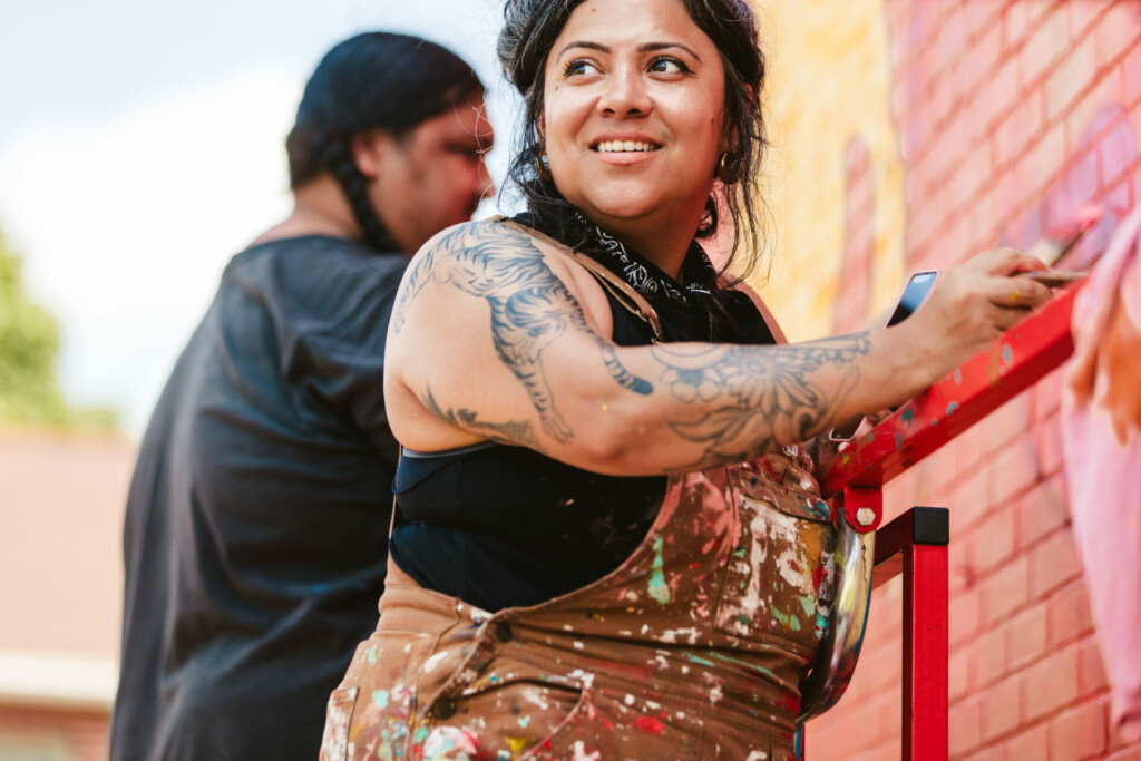 Muralists Maria-Jose (MJ) Lindo-Lawyer and Joshua Lawyer make up the Rough Edge Collective team. The husband-and-wife team, both children of immigrant families, each became obsessed with using art to create the world they wanted to see from an early age. The Bay-Area couple has been working as full-time muralists since 2019.