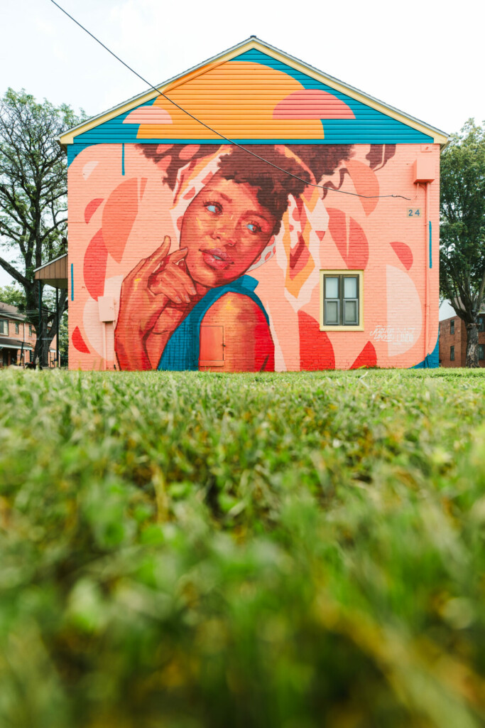 Completed by the husband-and-wife team Joshua Lawyer and Maria-Jose (MJ) Lindo-Lawyer, this bright portrait of a woman was drawn in the image of a friend of the couple’s.
