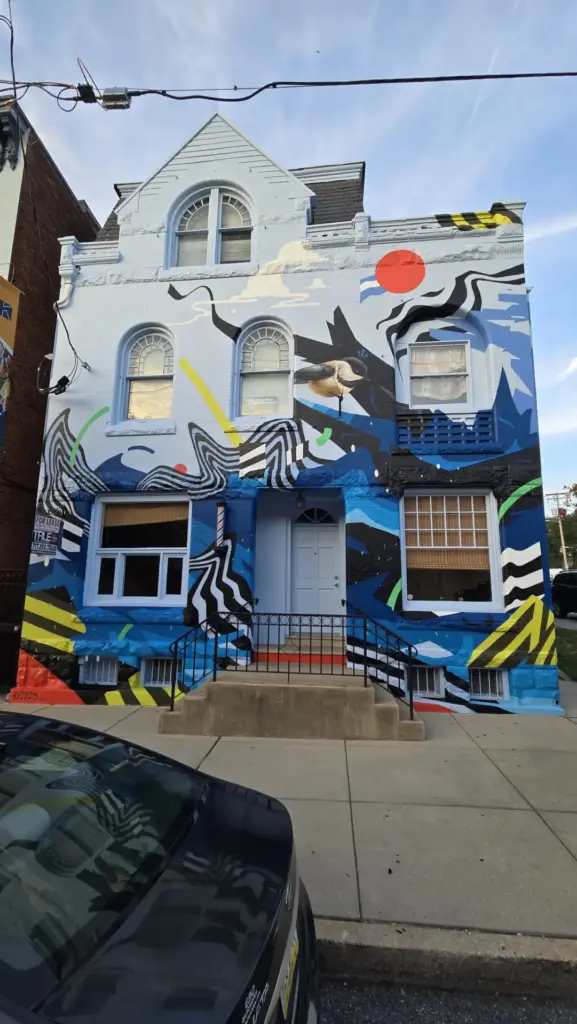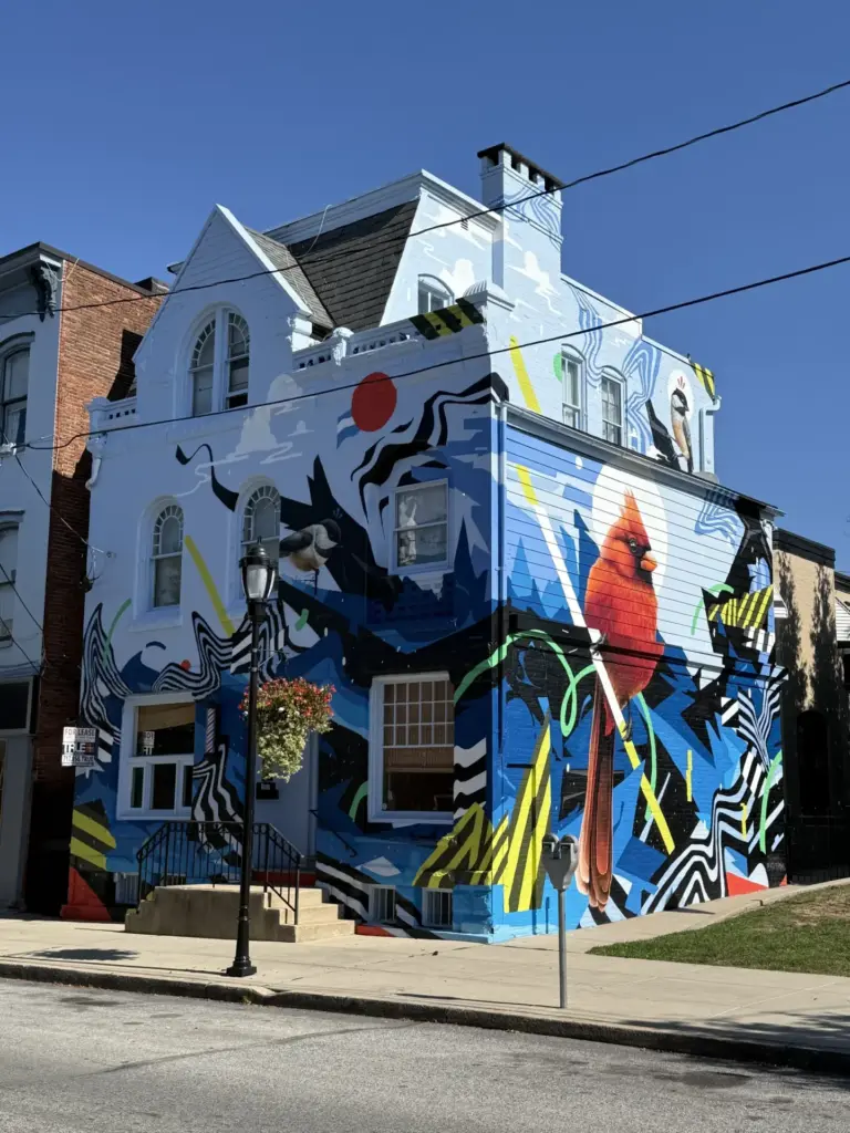 “The rest of the mural is abstract, creating a colorful playfulness,” Nichols said. “I had a loose idea of what the mural would look like, but I just made it up as I went and just had fun playing around, sort of like I would as a kid running around his grandma’s house. This was intended to give the mural dimension, movement, and to create a “pattern” like feel when the viewer is up close. From afar, the bird(s) appear calm, looking out over the chaos, like how our mothers and grandmothers look out for us in a crazy world.”