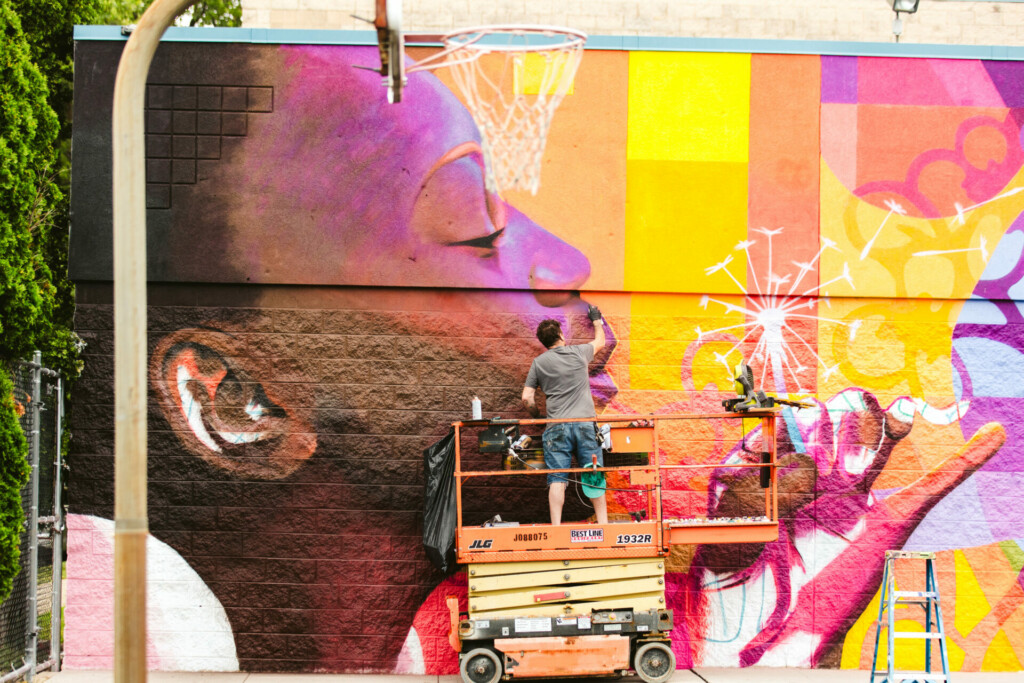 This bright, bold, beautiful mural flanking the Harrisburg Boys and Girls Club’s John N. Hall Club House and covering the adjoining basketball court was painted by the internationally acclaimed muralist Osiris Rain in the summer of 2025. It is his first Pennsylvania mural and Sprocket’s first mural to cover a basketball court.